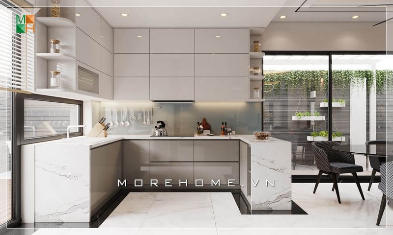 Thiết kế nội thất bếp chung cư hiện đại, kệ tủ bếp đẹp thiết kế hợp lý và tiện lợi.