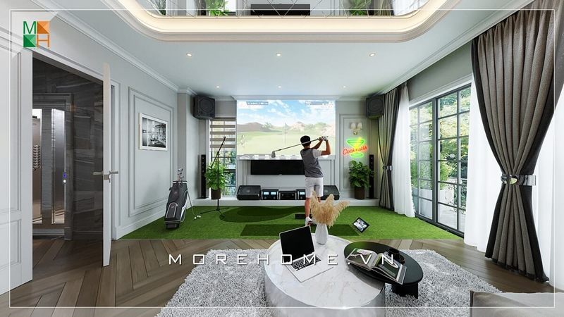 Tạo ra một thiết kế nội thất độc đáo cho biệt thự bằng cách bố trí sân golf nhỏ và sử dụng vách kính ngăn thông thoáng hiện đại.